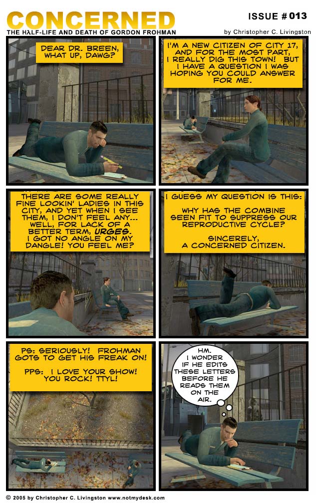 In the game, you hear Dr. Breen reading a letter during his broadcast. He says: "I'd like to read a letter I received. Dear Dr. Breen: Why have the Combine seen fit to suppress our reproductive cycle? Signed, a Concerned Citizen." This is where the name of the comic comes from, and we see that Frohman had a little more to say than was read on the air. Posing Notes: The idea is to make Frohman look completely at ease in City 17, as opposed to the rest of the populace (I started with him just sitting, but then had him relax a bit). In hindsight, the woman sitting on the bench shouldn't have been looking so comfortable and casual. This is Michelle, who Frohman will hit on later in the comic. I drew Frohman's pencil in Photoshop, and it looks absurdly big (which wasn't my intention, I just suck at drawing). While I was posing Frohman on the bench, an in-game character walked over and sat down on him. A little later, an in-game Frohman walked over and sat down on him. |