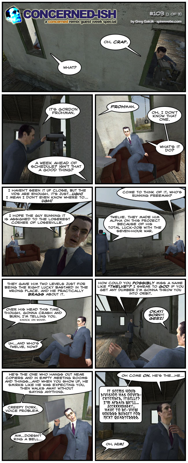 Hello, I am Greg. How are you this fine day. A while back I had this idea and I was going to get it together as fan art to send to Chris, but as it got bigger and more involved I figured I'd pitch it to him as a guest week. As total luck would have it, it sort of intersects with the Concerned story. In the game, when you get to this building, you can look through that binocular-scope thing and see the rebel base where Frohman just showed up in #102. This is good, because otherwise I would've pissed away all the time it took to get this done. But it's also why this one's longer than a usual Concerned; when I first started making them I didn't plan on breaking it up into three parts, and by the time I made that decision it was way too late to go back and change things. But even if I had, I'm not sure I could do it; one thing Chris does well is keeping a good joke down to six panels. It's a lot harder than it looks. When you get to this building in the game, there are a couple soldiers in there. I wanted to set them up, leaning against a wall statue-like, as if these two guys had suspended them there while they did their thing. But it wound up not being clear enough, and I think two frozen Combine would've cluttered the scene more than helped it. For non-players: I'm way off the HL2 plot, here. This fan-art from Dan put the, er, spark in my head about thinking up surrounding details, and I what-iffed my way to a whole organization of guys who look like G-Man and have their own agenda. |