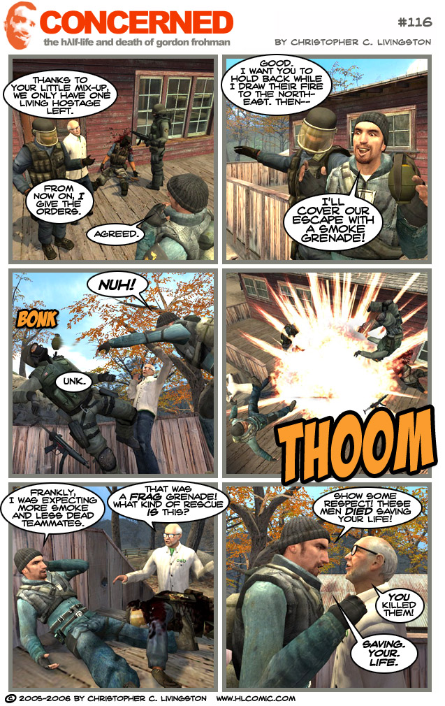 When I'm in G-Mod making these comics, I generally get lots of "coverage", that is, I take lots of pictures of each setup from different angles and at different distances, so I have some stuff to work with in the "editing room." If I need to add or subtract dialogue I'll have wider or tighter shots available, and it lessens the chance of having to go back into G-Mod and repose and reshoot anything. Sometimes there's a drawback to this, such as when multiple shots of the same panel turn out nicely. Then, I have to decide which one to use. Blowing up stuff in Half-Life 2 usually results in some great pictures. (Warning: Full-size screenshots ahoy). Decisions, decisions, decisions, decisions. Then there's this shot. I don't know if that's ragdoll blood shooting out into the camera or what, but it's weird. Haven't seen that happen before. I did the explosions using the HL2 Deathmatch "SLAM" mines, and they blow up every so lovely. I first tried the G-Mod dynamite, which is nice because you can set a timer, but they blow up in a poof of black smoke and not the glorious bright flash the SLAMs do.