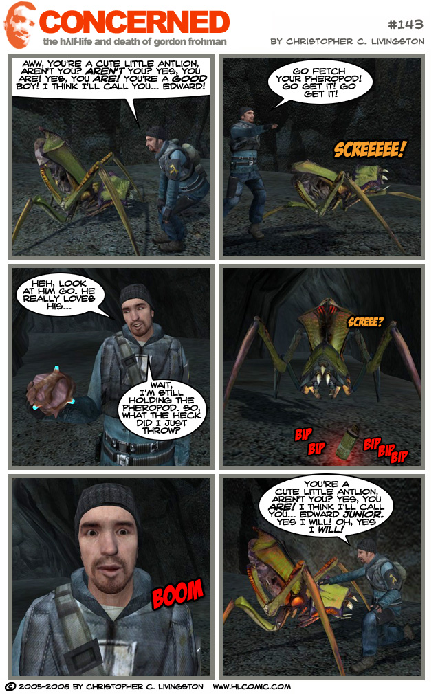 Huge thanks to Joe for keeping the comic alive with his three "Behind the Comic" guest strips while I was on a ten day whirlwhind tour of five states and roughly 700,000 relatives, many whose names I still don't know. Anyway, I'm back. The antlion in today's comic is named after one of the forum members who won a little G-Mod posing contest on the board a while back -- that was the lame prize I came up with. Congratulations! See, I didn't forget. And, if all goes as planned, you should be able to start preloading Half-Life 2: Episode One today. Preloading via Steam is neat, because when the game is released, you get to play it more or less immediately. Not so neat is realizing that the game is sitting on your computer, more or less ready to play, for weeks before it's unlocked. It's like having a big Christmas present in November, just sitting on your desk, cloaked in some sort of tamper-proof wrapping paper, and about once a week the package gets a little bigger and more enticing. Anyone who preloaded the original HL2 knows what I'm talking about. Here we go again.