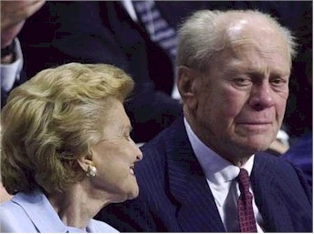Next week: Back to temping stuff! The change of pace has been nice, but we here at Not My Desk are bursting with new ideas to help temps pass the time. Starting Monday, we'll answer some e-mail, check out a movie review, learn about a great new game everyone can play, and explore the mystery of forgotten Post-it Notes! Jesus. I've got to get a life. e-mail: temp@notmydesk.com Well, great. First thing I find out upon getting to work this morning is that Gerald Ford had not one, but two strokes over the past 24 hours. Meanwhile, here sits my website, mocking the old codger, suggesting that his expressions of distress during the Republican National Convention revolve in some way around the fact that he can't get into Nancy Reagan's pantsuit. There I was, making my first foray into the arena of political satire, to join the ranks of John Trumbull, Gary Trudeau, Will Durst, and the Capitol Steps, and I was immediately thwarted Gerald Ford's ailing health. According to CNN, Ford is in good shape, but the fun, in my mind anyway, has been dampened. Anyway, I'm canceling tomorrow's feature, which included more subtle political humor such as pictures of George W. Bush with a word balloon coming out of his mouth saying "I'm a big doody-head!". Man. That would have been great. 8-2-00 - Nancy Reagan Does the Republican National Convention Family values, my ass. The Republican National Convention is just an excuse for a bunch of old politicians to engage in an unholy orgy of wrinkled flesh and wife-swapping. Don't believe me? Just check out the Associated Press photos below. "Nancy, my wife and I have an understanding..."